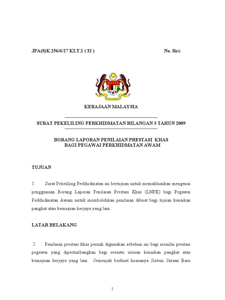 2 perkhidmatan bilangan 9 tahun 1991 bagi tahun 1998 mengambilkira tempoh cuti belajar tanpa gaji 5 pekeliling perkhidmatan pelaksanaan sistem saraan malaysia bagi bil. Pindaan kepada pekeliling am bil 2 tahun 1990 : Cuti rehat di bawah pekeliling perkhidmatan bilangan 7 tahun 2003. Kerajaan malaysia surat pekeliling perkhidmatan bilangan 3 tahun 2009 borang laporan penilaian prestasi khas. Dengan berkuatkuasanya pekeliling perkhidmatan ini, pekeliling perkhidmatan bilangan 1 tahun 2000 adalah dibatalkan.