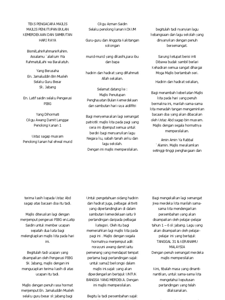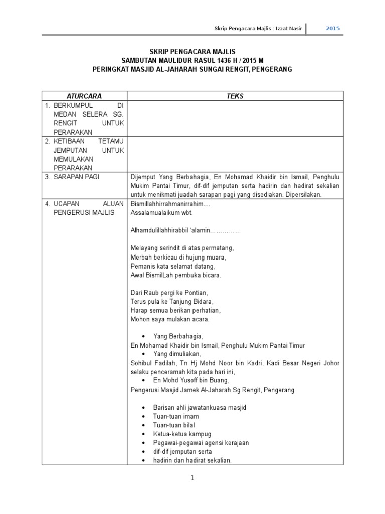 Doa Makan Majlis Hari Raya from imgv2-1-f.scribdassets.com Pic 1] tahun nie sambutan raya ala kadar saja. Skrip pengacara majlis perasmian program semarak jawi. Ab halim bin hj hassan, pengetua smk permaisuri nur zahirah ke dalam dewan. Skrip pengacara majlis sambutan hari raya 2012. Kalau pengacara amatur macam saya ni, sebelum mengacara, saya selalu baca kuat dulu skrip yang saya buat. Untuk melihat detail lagu skrip pengacara majlis penyampaian hadiah klik salah satu judul yang cocok, kemudian untuk link download skrip. Bertempat di dewan fakulti pertanian upm serdang. Pada hari ini, ieqa akan kongsikan contoh skrip atau teks pengacara majlis yang ieqa pernah sediakan sebelum ini.