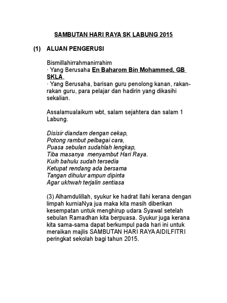 Faridah binti omar, penolong kanan pentadbiran, en. siti ruhana mengumumkan ketibaan yang berbahagia , en. Seterusnya, majlis diteruskan dengan penyampaian hadiah untuk hari lahir, kelahiran cahaya mata, guru mengaji dan perpisahan. Skrip pengacara majlis perasmian program semarak jawi. Pihak majlis mohon mengambil kesempatan waktu di penghujung ini untuk mengucapkan ribuan kalungan bunga terima kasih kepada semua pihak yang terlibat dalam memastikan majlis sambutan hari raya aidilfitri peringkat sekolah ini dapat dilangsung dengan meriahnya.