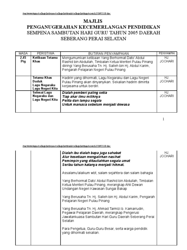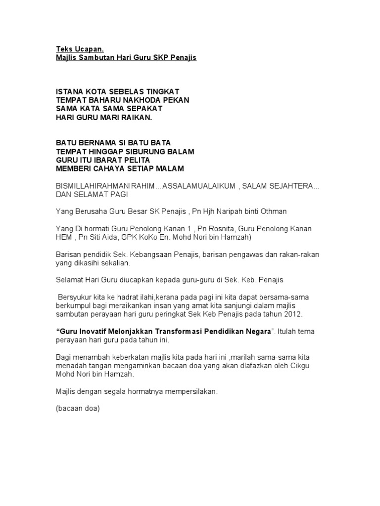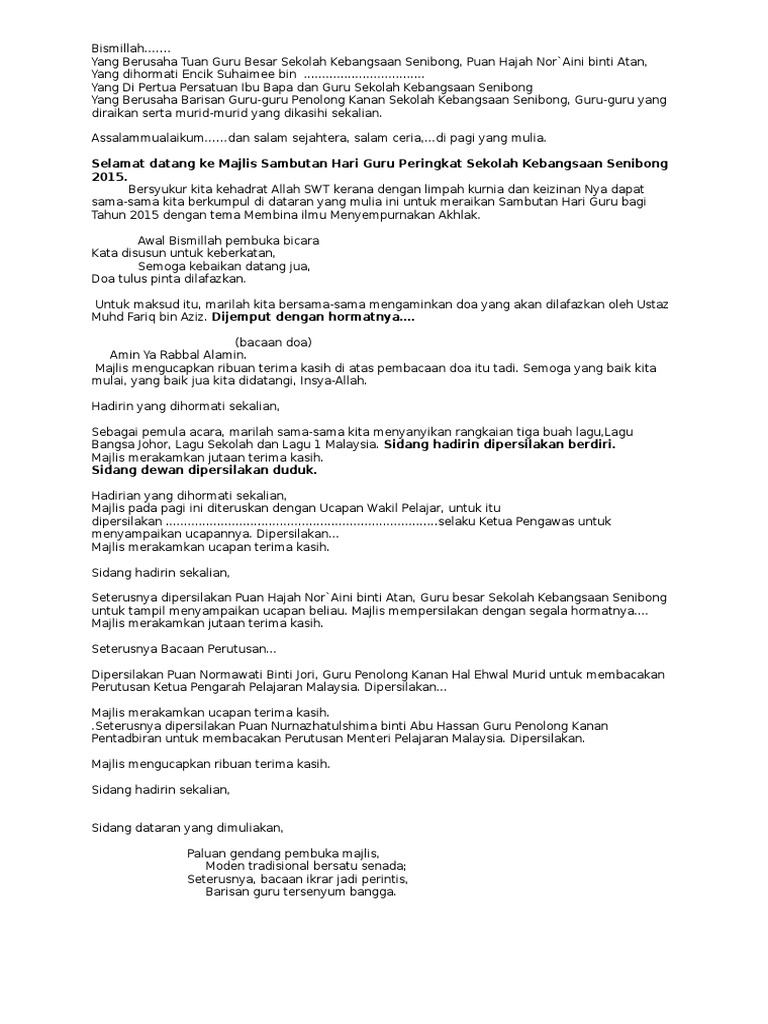 20 contoh teks mc formal dan non formal dalam berbagai acara. Saya mohon untuk mc hari guru nanti ek. Pidato hari guru bahasa jawa (sesorah guru) pada kesempatan ini, saya akan berbagi kepada sahabat sebuah naskah pidato bahasa jawa dengan tema hari guru nasional atau sesorah guru. Mc membacakan aturcara majlis yang akan berlangsung. Selamat pagi dan salam sejahtera bagi kita semua. Menteri pendidikan kementerian pendidikan malaysia 21 mac 2019 Teks mc di atas bisa digunakan untuk acara di tingkat sd, smp, sma ataupaun mahasiswa dan umum. Teks mc majlis penutupan khidmat bantu pss negeri terengganu 2013.doc. Kepincangan majlis ini adalah kelemahan daripada pihak kami dan kemaafan jua yang kami pinta. Teks ucapan mc sempena hari guru 2012. Dan ini hasil teks mc saya. Yang berbahagia, tn.hj mhd ramli bin che mat, pengetua smk permaisuri nur zahirah. Assalamualaikum w.b.t, salam sejahtera, salam 1 malaysia.